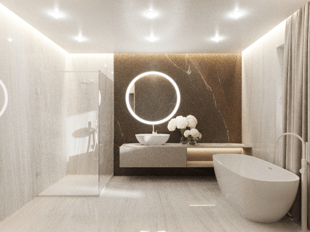 Проект створювався для замовників, які віддають перевагу натуральним матеріалам та бежевій гамі. Камінь із яскраво вираженою фактурою та натуральне дерево стали головними акцентами в оздобленні простору.