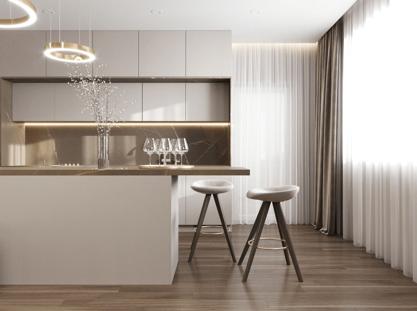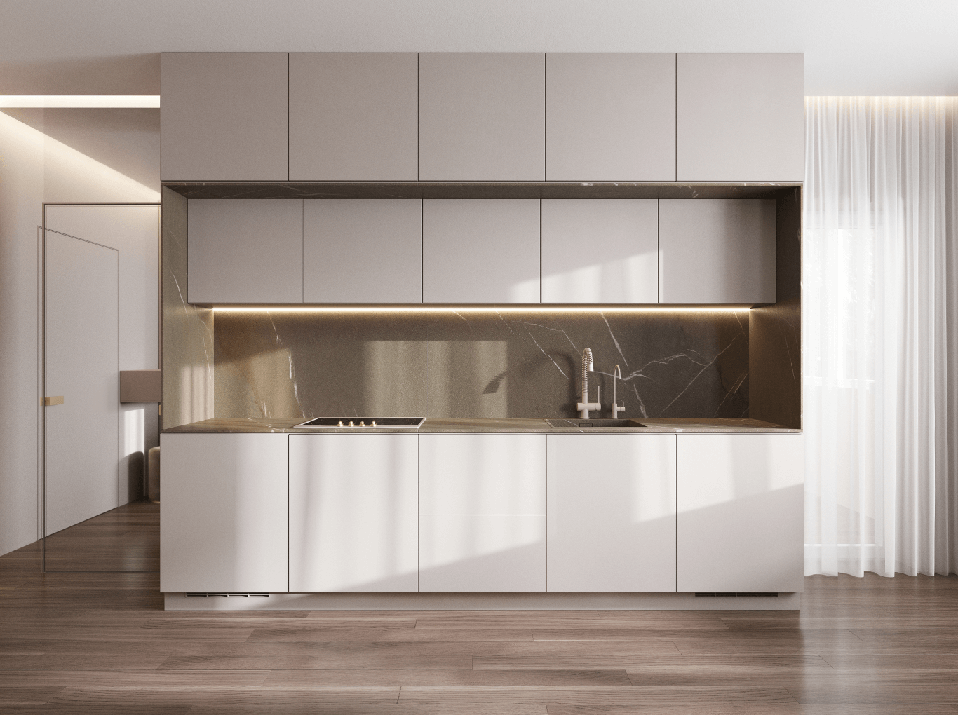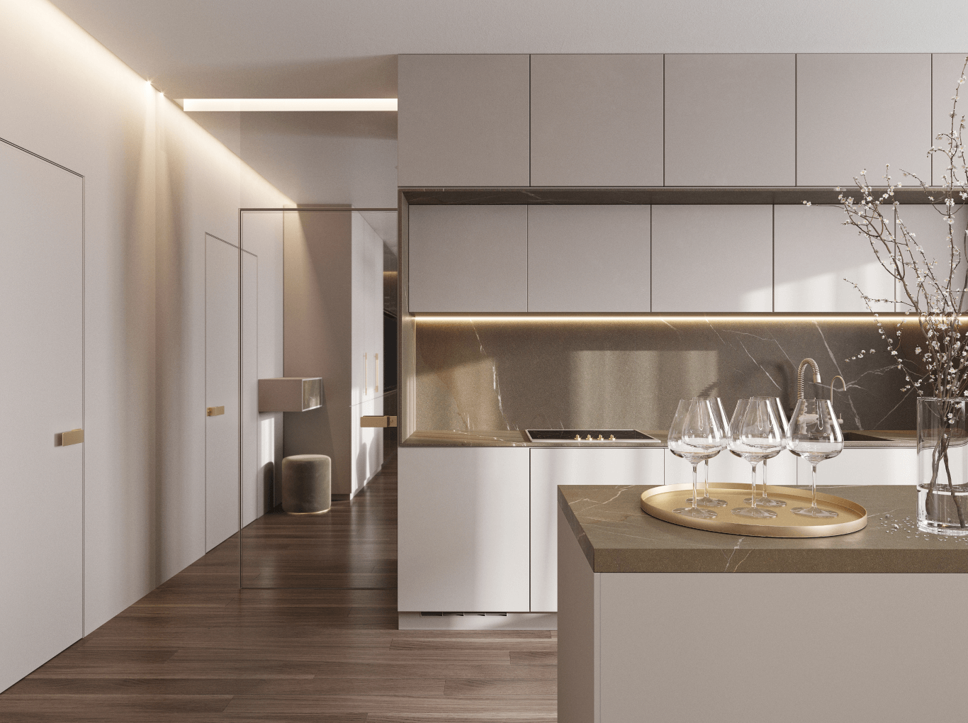 Ми зробили перепланування і об'єднали в один об'єм вітальню, кухню та передпокій. Пріоритетним завданням було максимально сховати побутову техніку та полегшити зону кухні, яка з'єднана з вітальнею. Для цього кухонні фасади розташували у двох рівнях, створивши відчуття ніші у стіні, де розташовується робоча зона. Холодильник сховали в одній із секцій шафи.