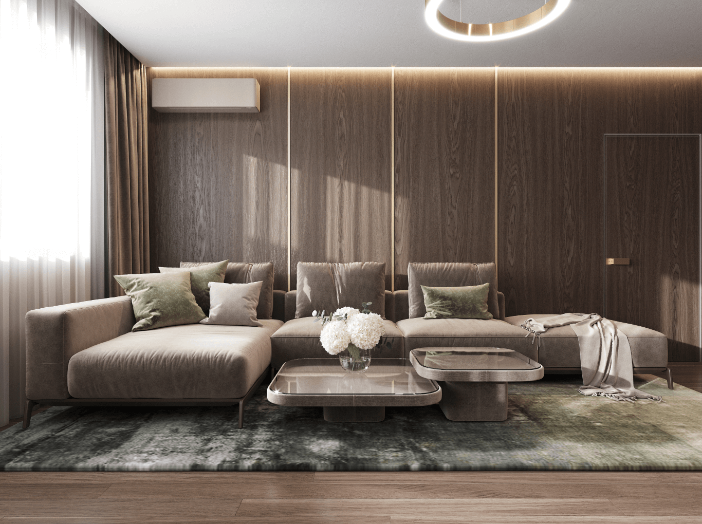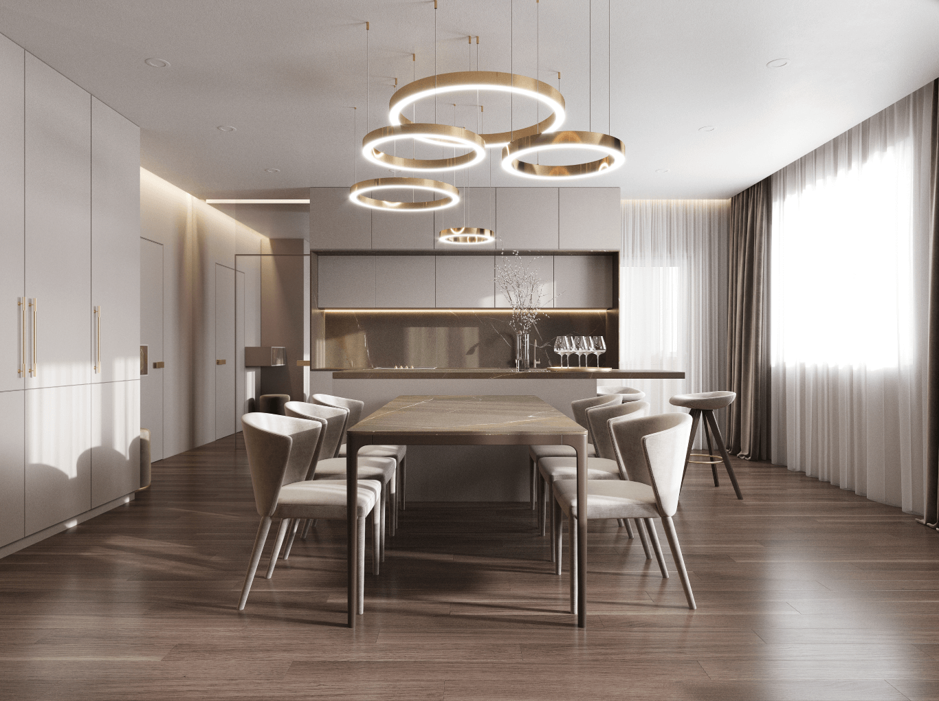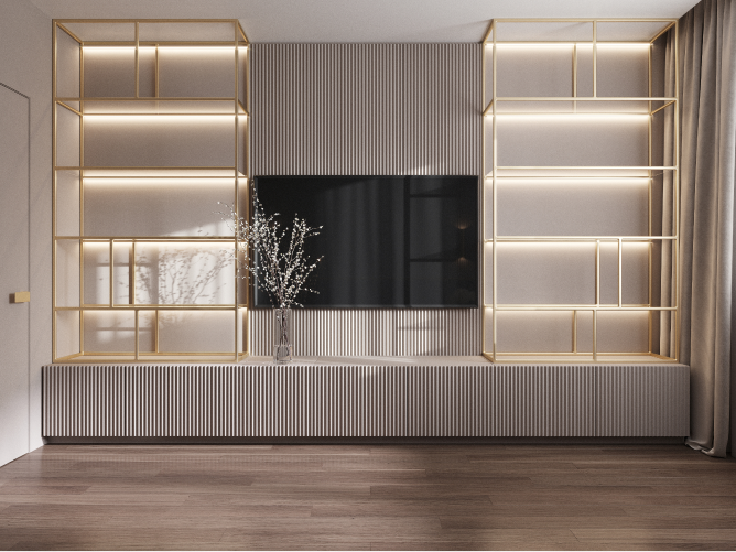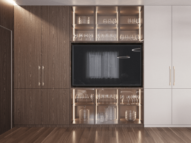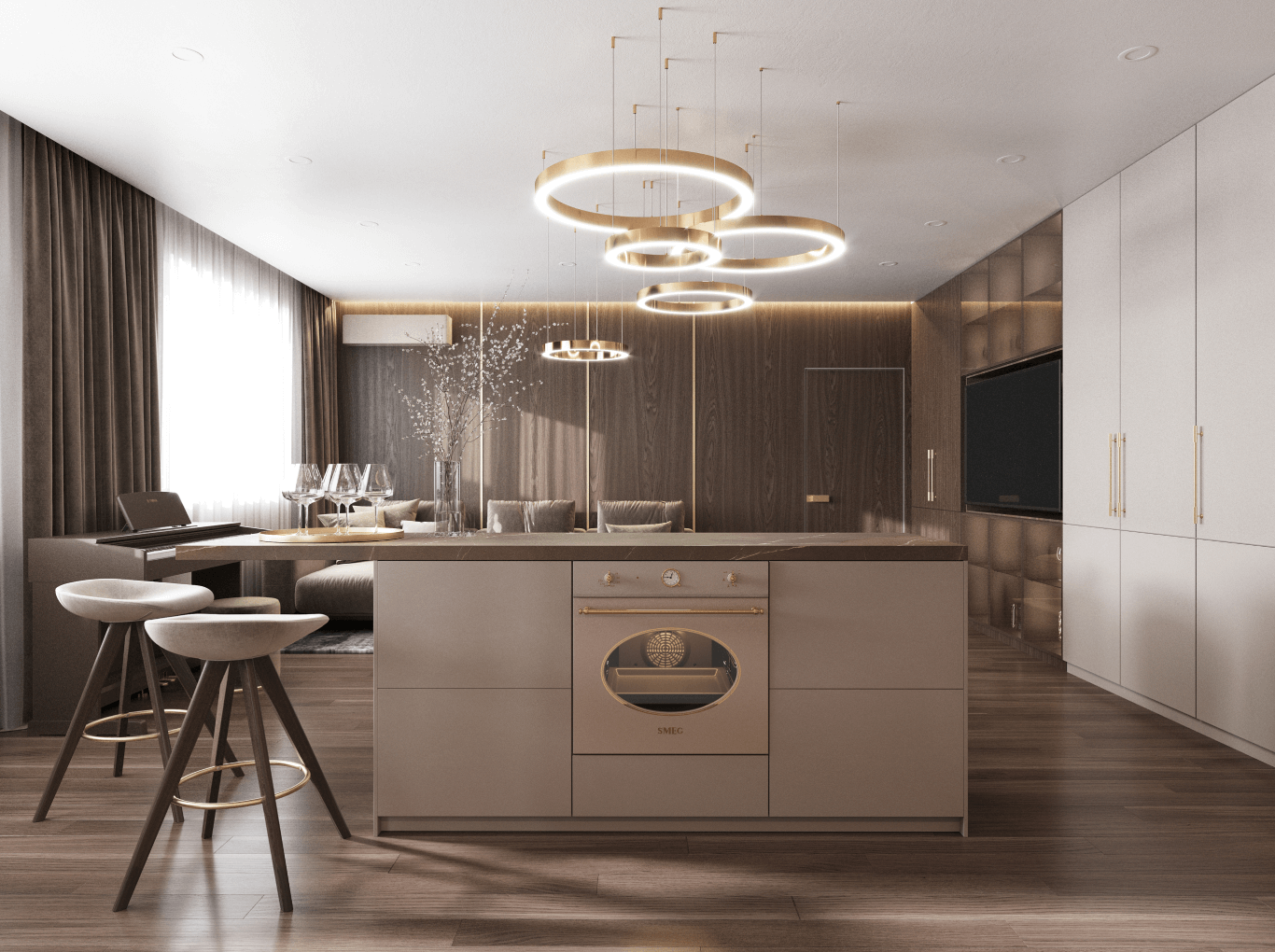 Ми зробили перепланування і об'єднали в один об'єм вітальню, кухню та передпокій. Пріоритетним завданням було максимально сховати побутову техніку та полегшити зону кухні, яка з'єднана з вітальнею. Для цього кухонні фасади розташували у двох рівнях, створивши відчуття ніші у стіні, де розташовується робоча зона. Холодильник сховали в одній із секцій шафи.