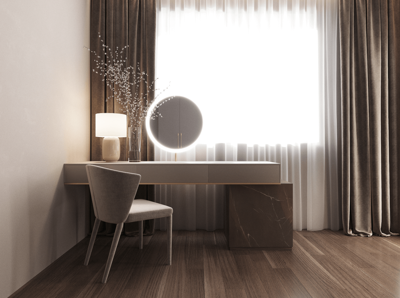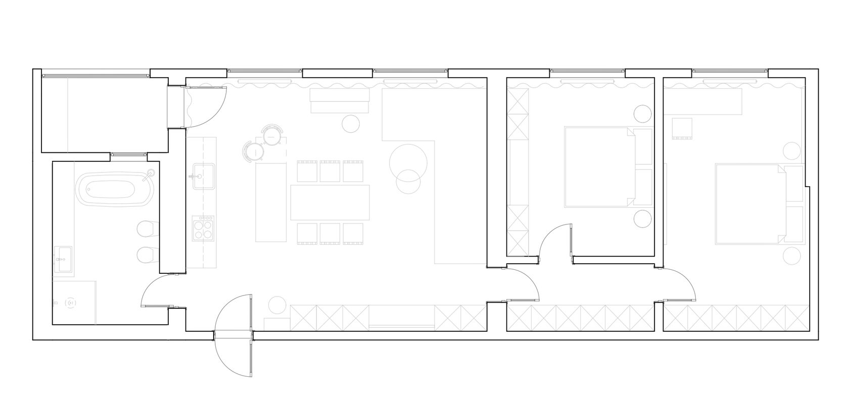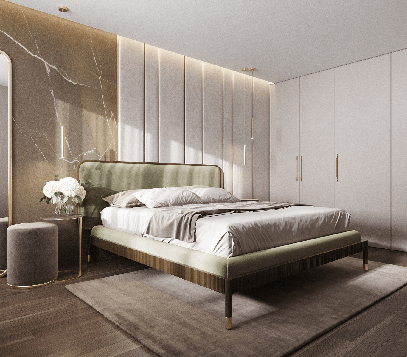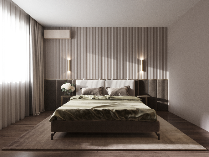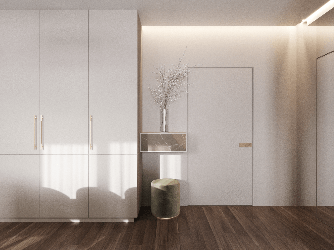 Вхід у квартиру захований за дверима прихованого монтажу. У хазяйській спальні м'які панелі біля ліжка створюють затишок і приховують стик стіни з колоною, що несе.