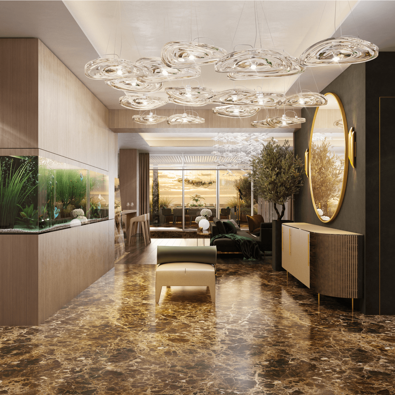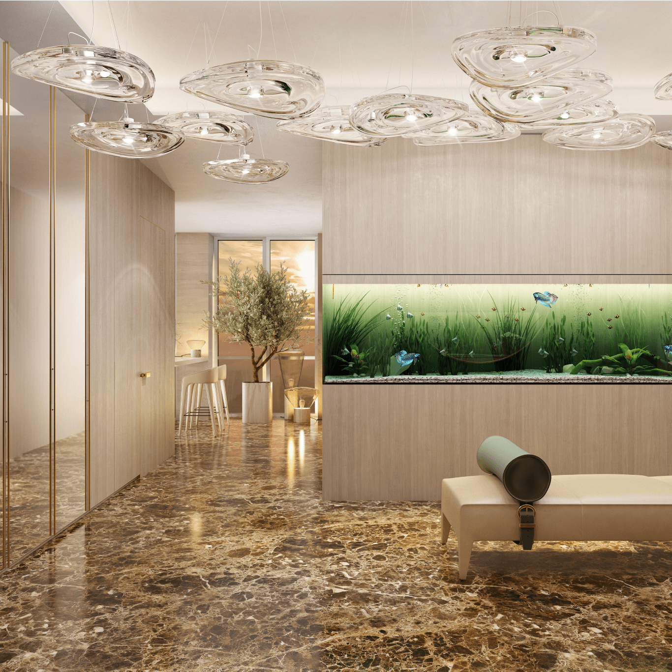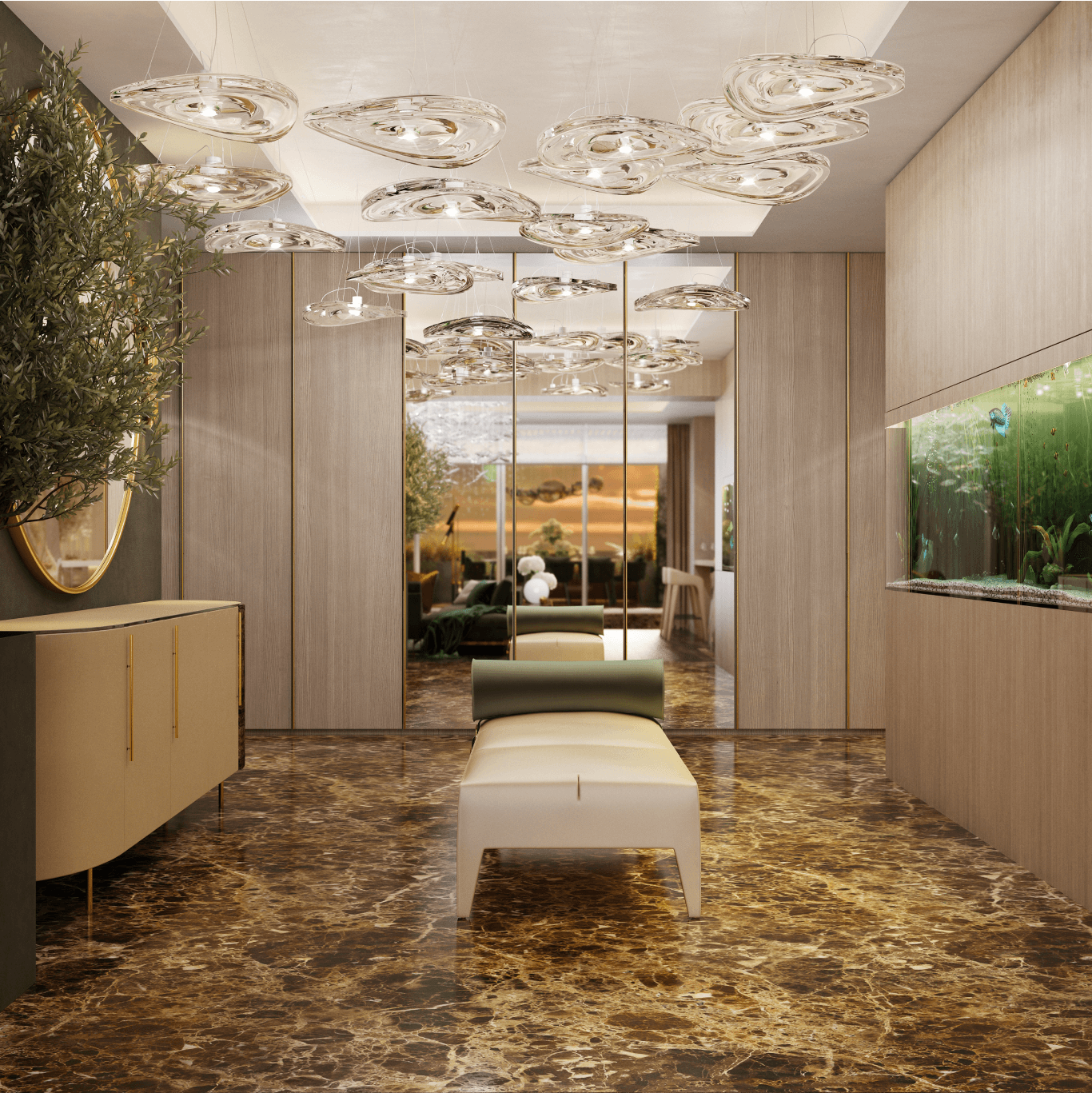 Затишок у вітальні створюється навколо каміна. Стіни обшиті панелями зі шпону, розділеними металевими вставками. Клієнт хотів мати можливість усамітнюватись у своєму кабінеті для проведення ділових зустрічей. Тому з вітальні можна потрапити до кабінету через подвійні звуконепроникні двері прихованого монтажу. У передпокої з'явилося місце, щоб відпочивати та насолоджуватися акваріумом.