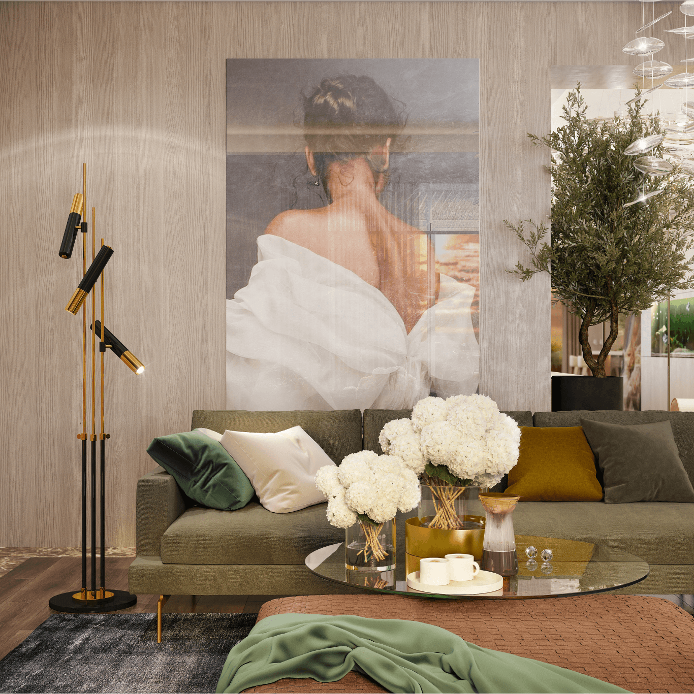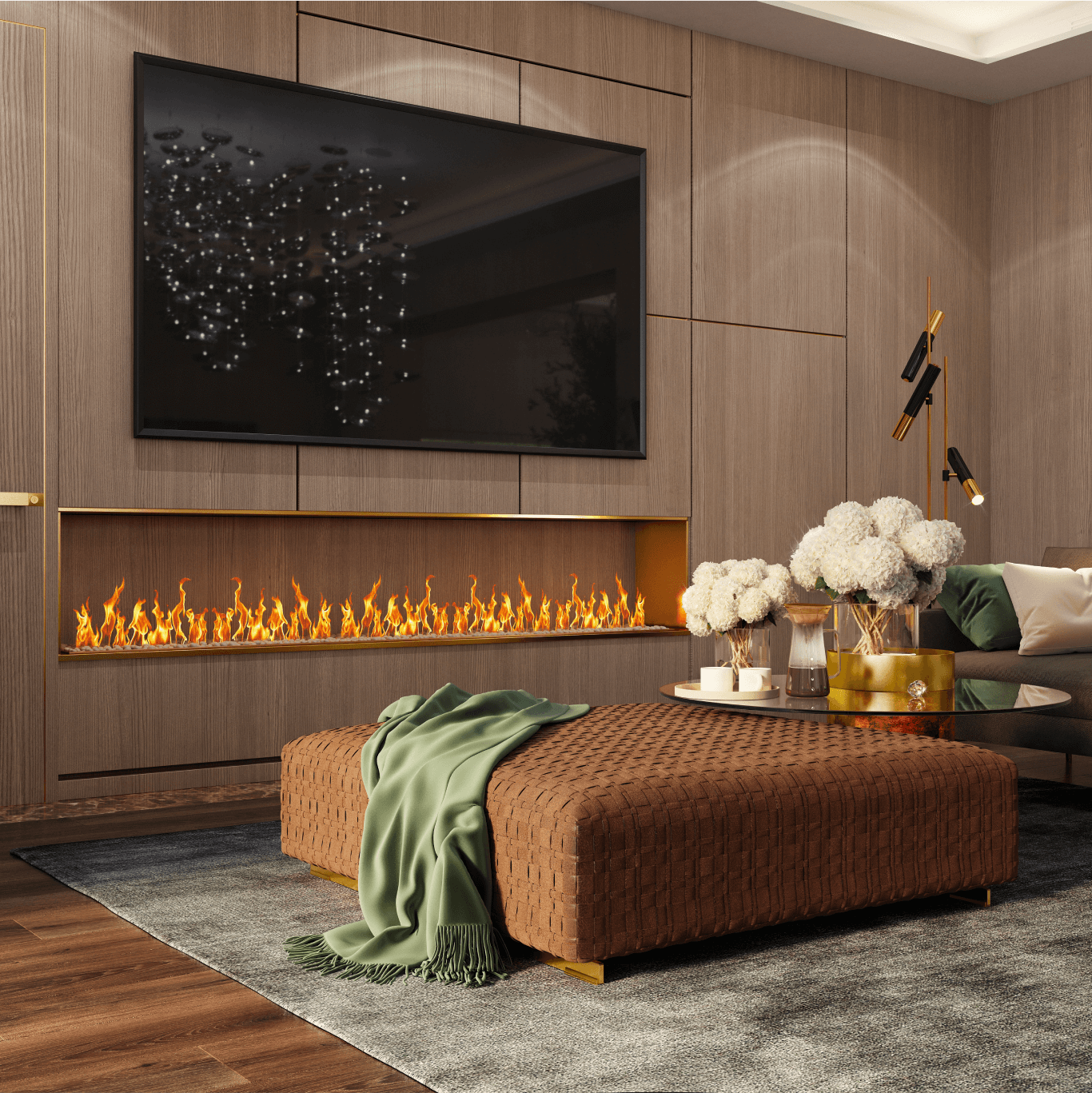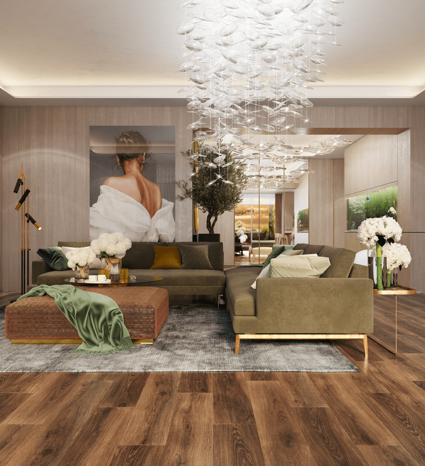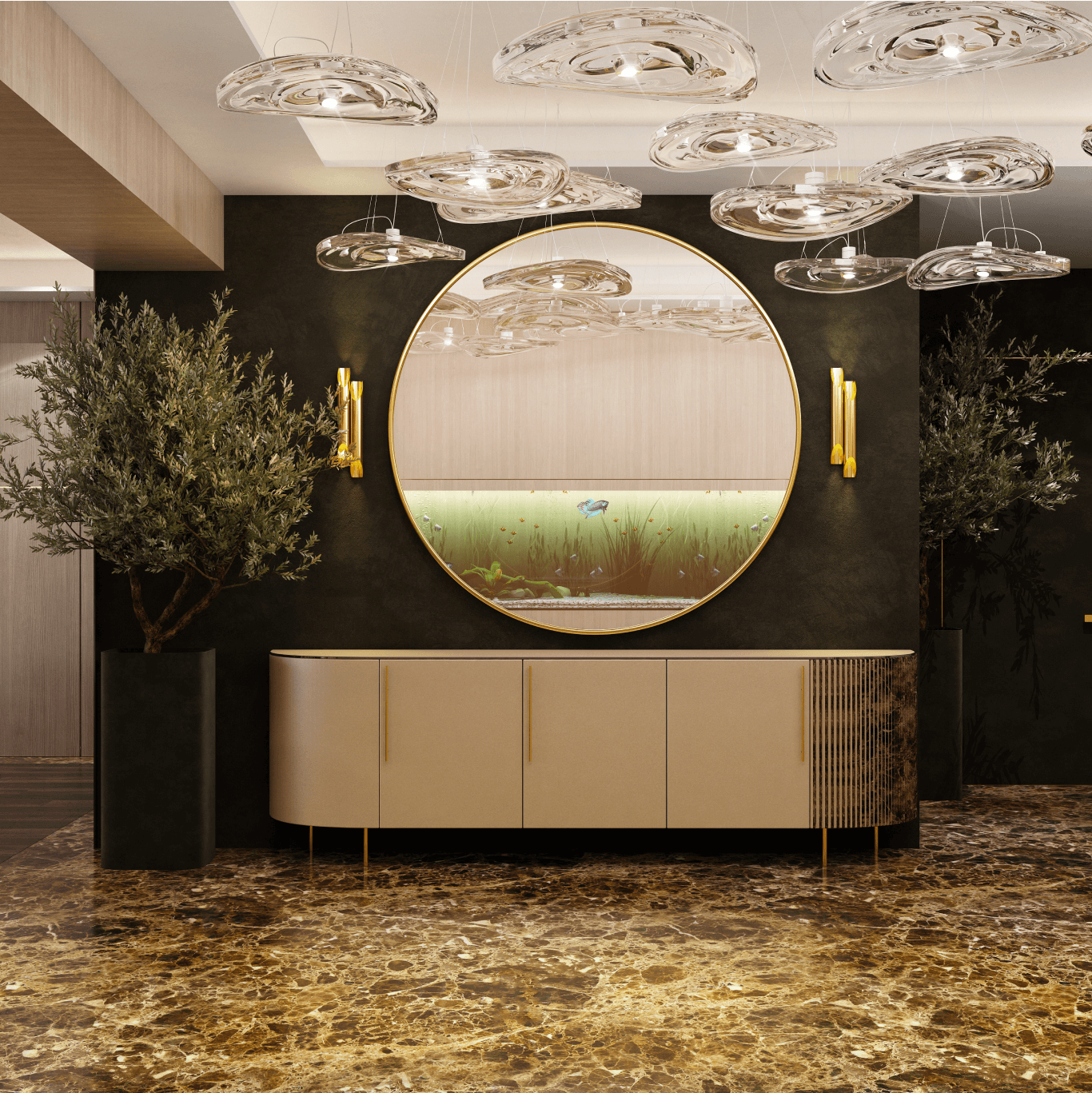Затишок у вітальні створюється навколо каміна. Стіни обшиті панелями зі шпону, розділеними металевими вставками. Клієнт хотів мати можливість усамітнюватись у своєму кабінеті для проведення ділових зустрічей. Тому з вітальні можна потрапити до кабінету через подвійні звуконепроникні двері прихованого монтажу. У передпокої з'явилося місце, щоб відпочивати та насолоджуватися акваріумом.