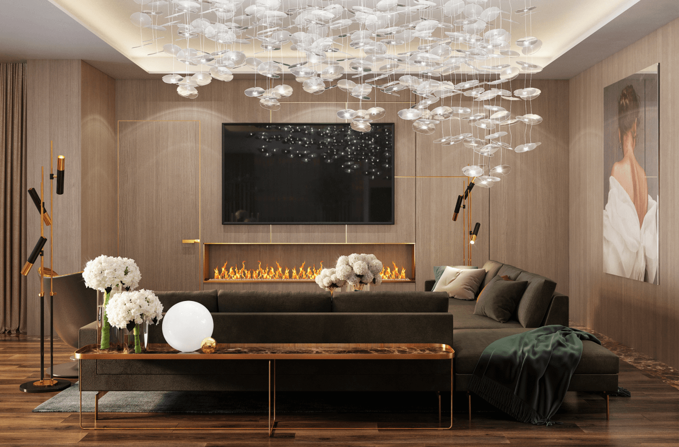 Замовнику подобався великий відкритий простір утворений вітальнею, столовою зоною та кухнею, але його побажанням було відокремити вітальню від інших приміщень.