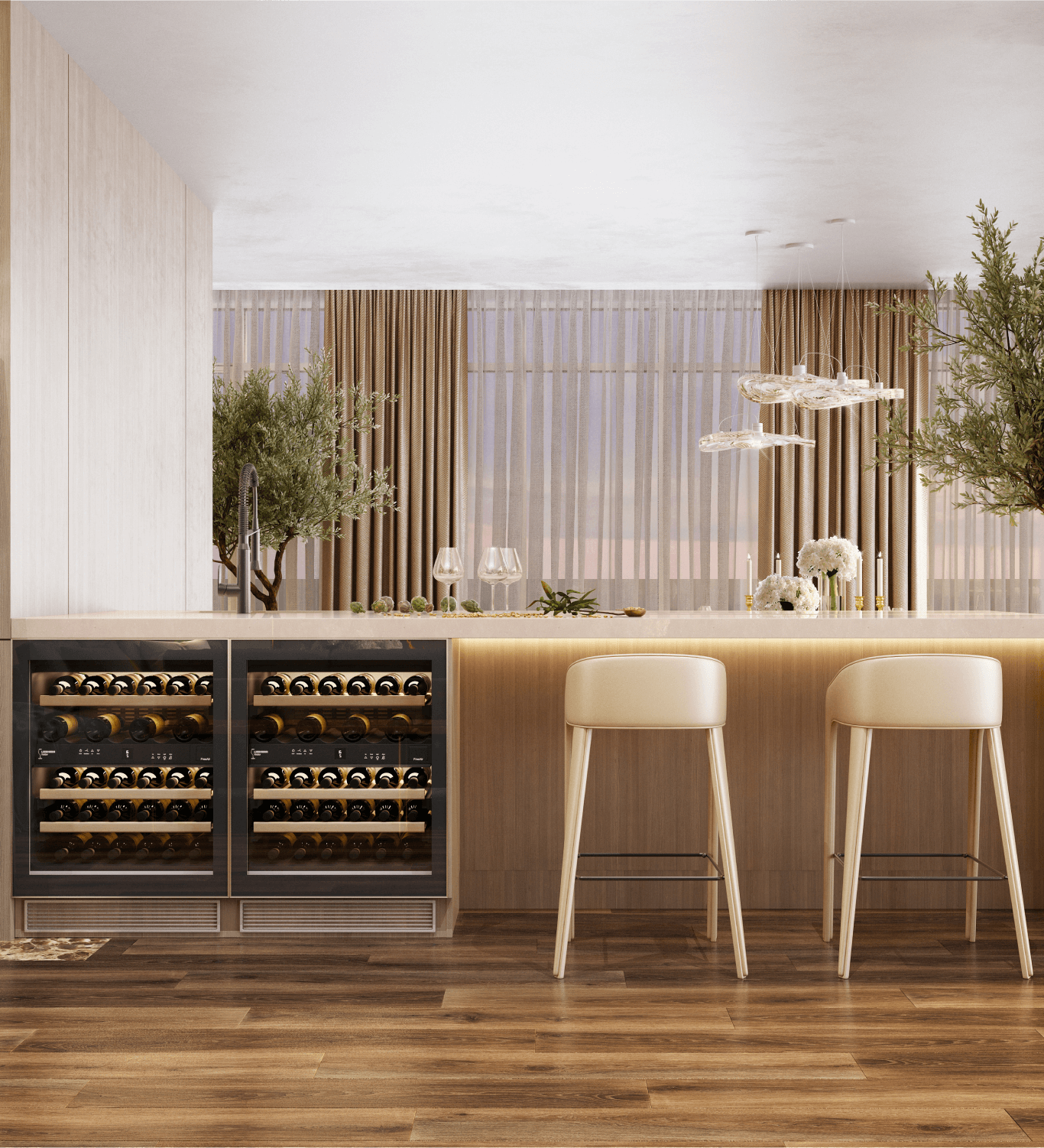 Нам вдалося візуально розділити ці приміщення довгим баром з винними шафами, що з протилежного боку може бути додатковою робочою поверхнею на кухні. Це рішення дозволило органічно вписати масивну колону посеред приміщення в загальний концепт інтер'єру.