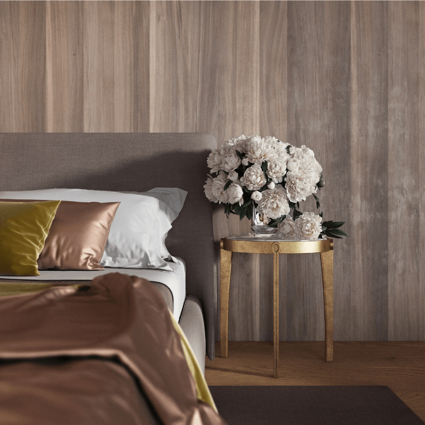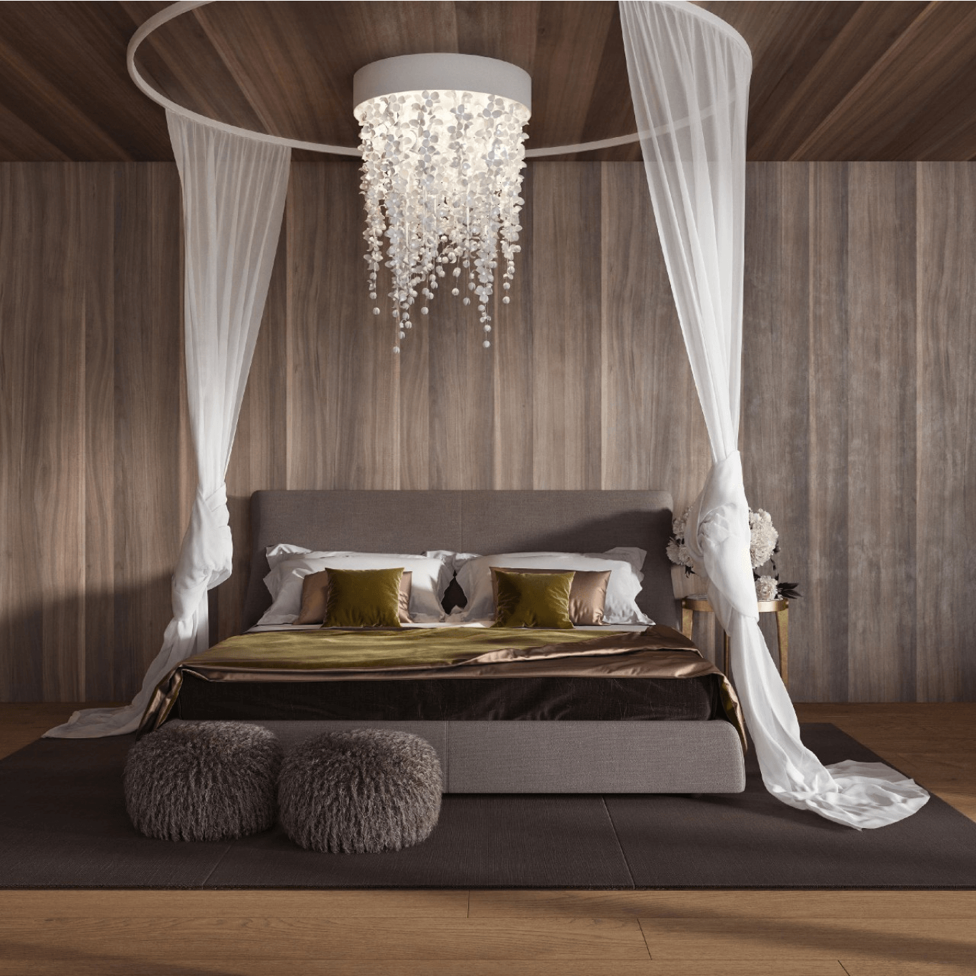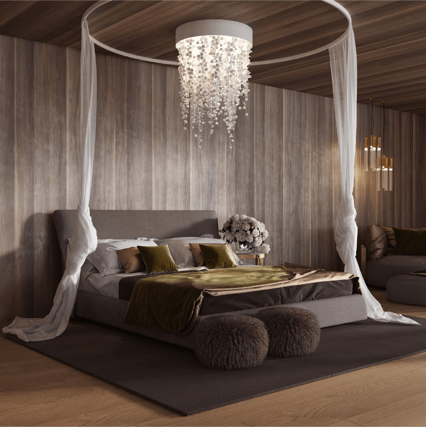 У хазяйській спальні ліжко накривається балдахіном і у поєднанні з люстрою створює чарівний ефект світлового затишку.