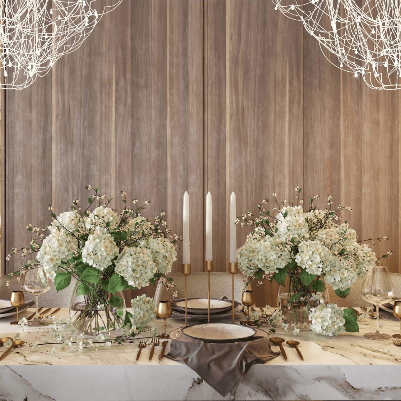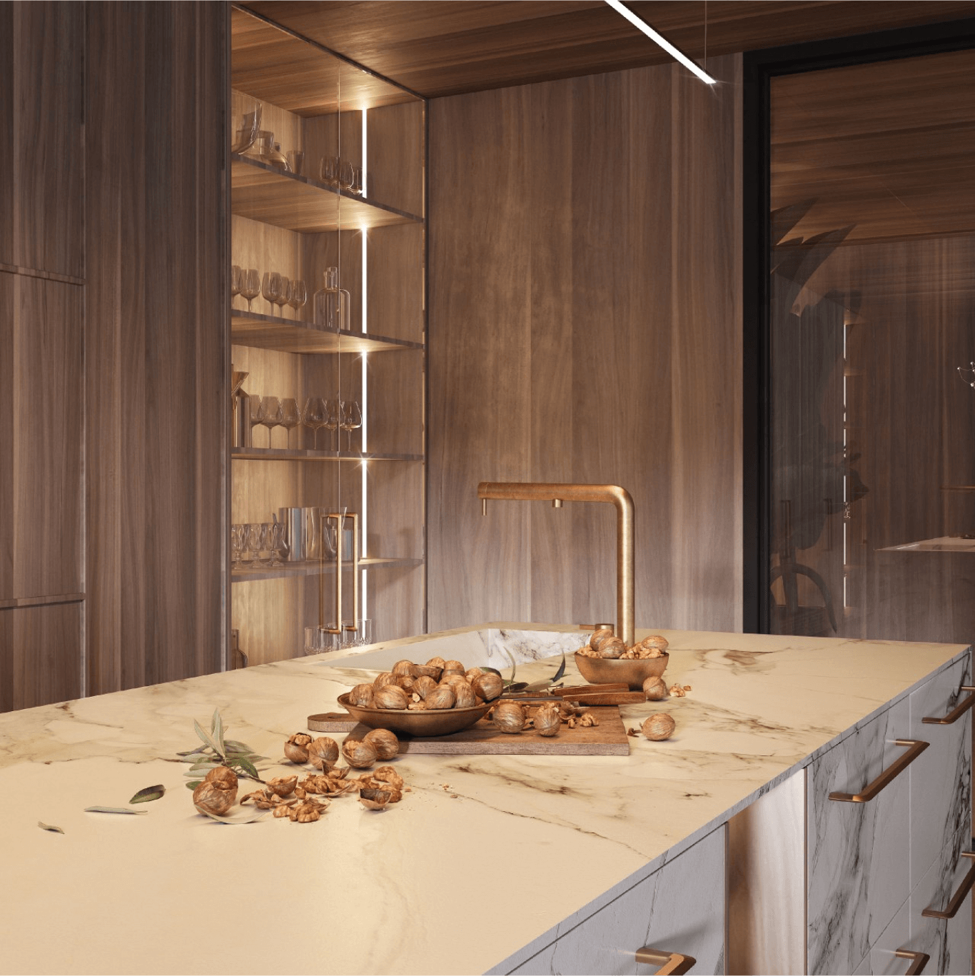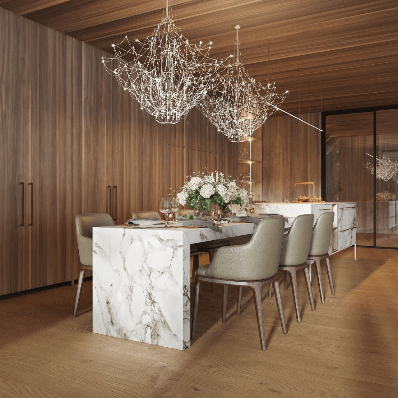 Для створення об `єму використовувалися різноманітні фактури та тонування дерева. У кухні обідній стіл та робоча зона виконані штучним каменем під білий мармур. Це той рідкісний випадок, коли білий елемент виступає як яскрава колірна пляма.
