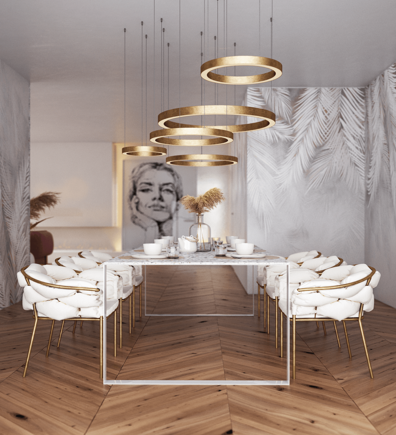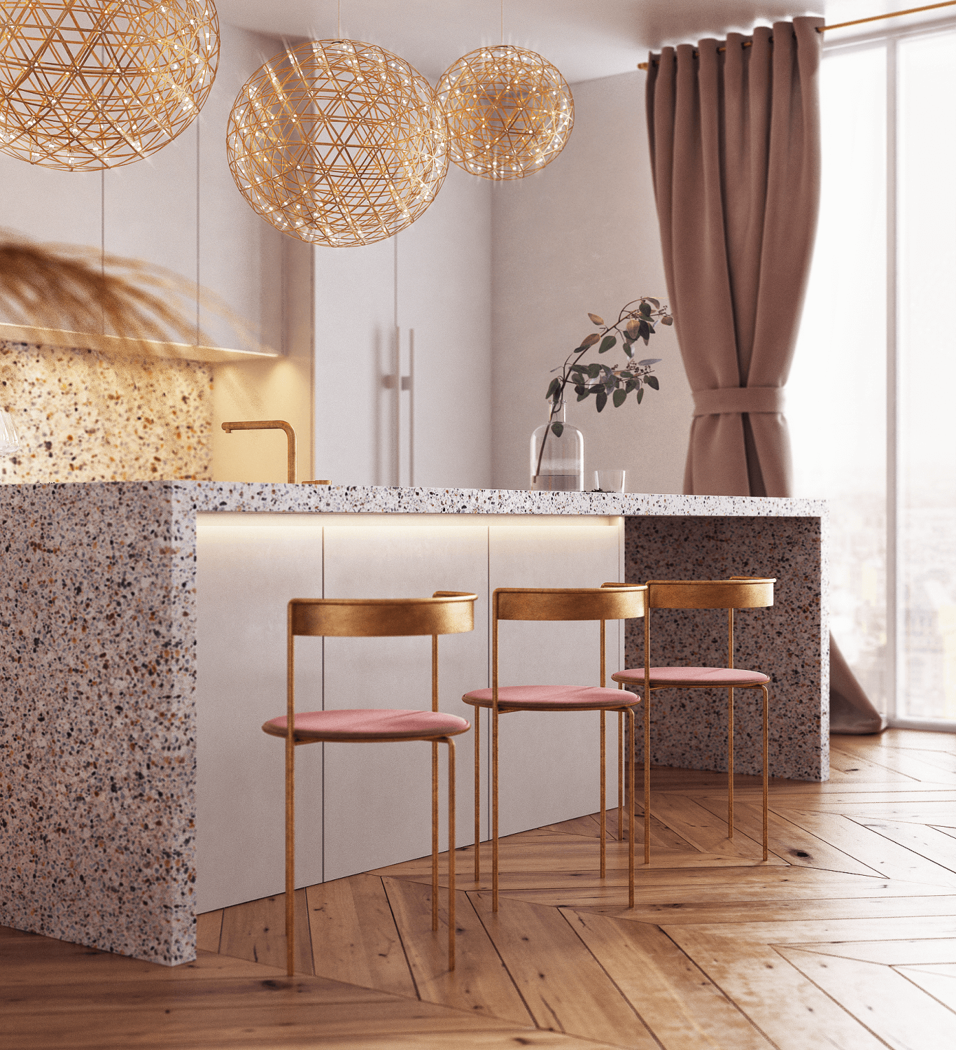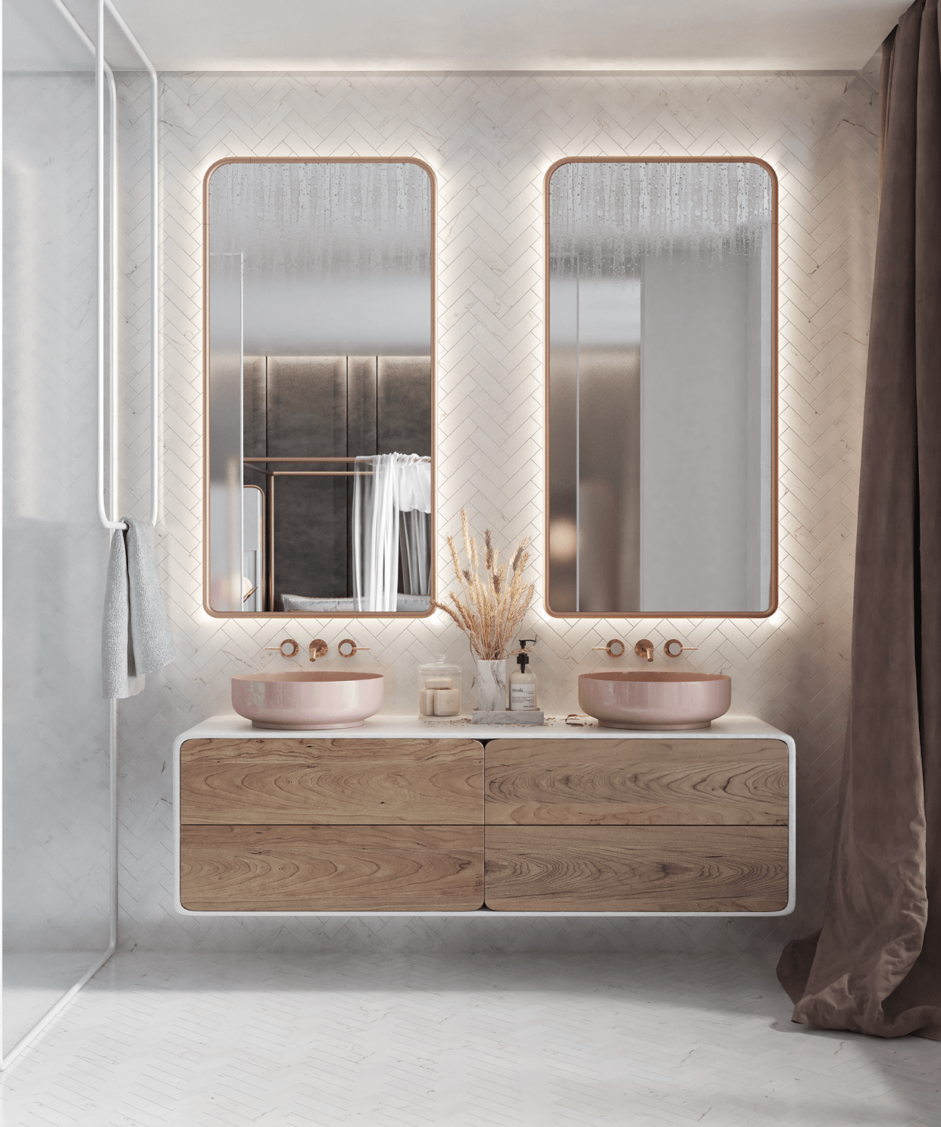 The accent of the white light space is the pink sofa, which creates a romantic and playful mood. The pink accents are complemented by wooden finishes and elements of copper and gold metal.