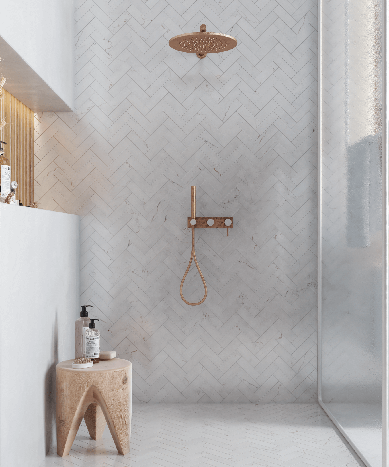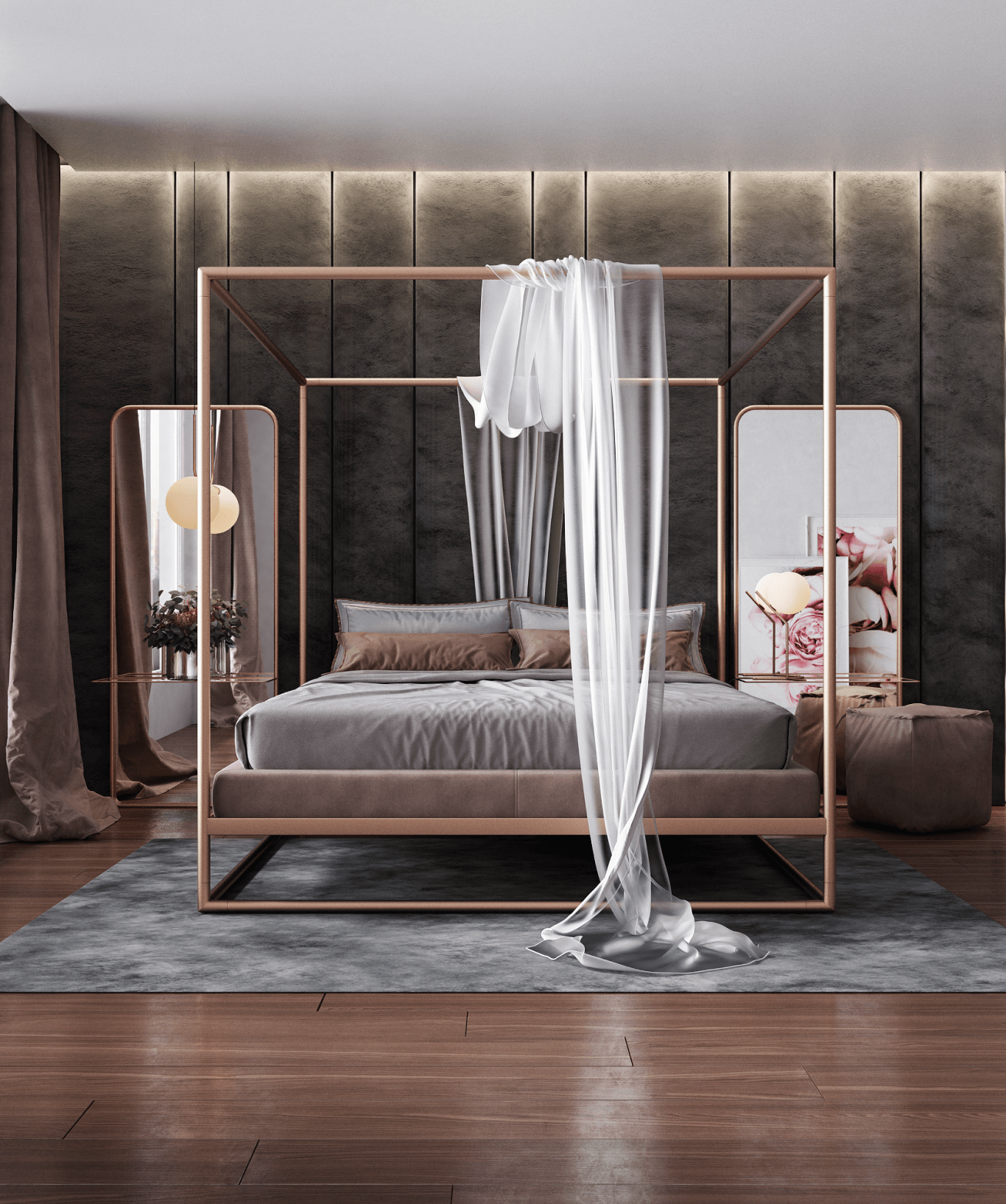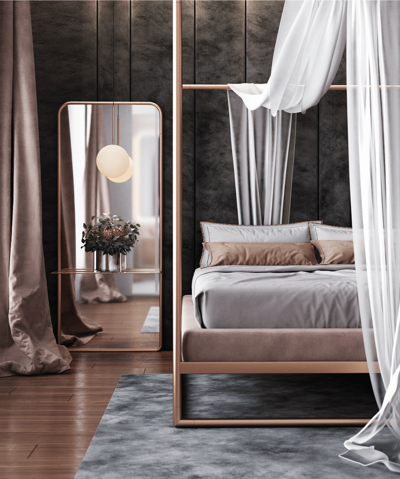 The accent of the white light space is the pink sofa, which creates a romantic and playful mood. The pink accents are complemented by wooden finishes and elements of copper and gold metal.