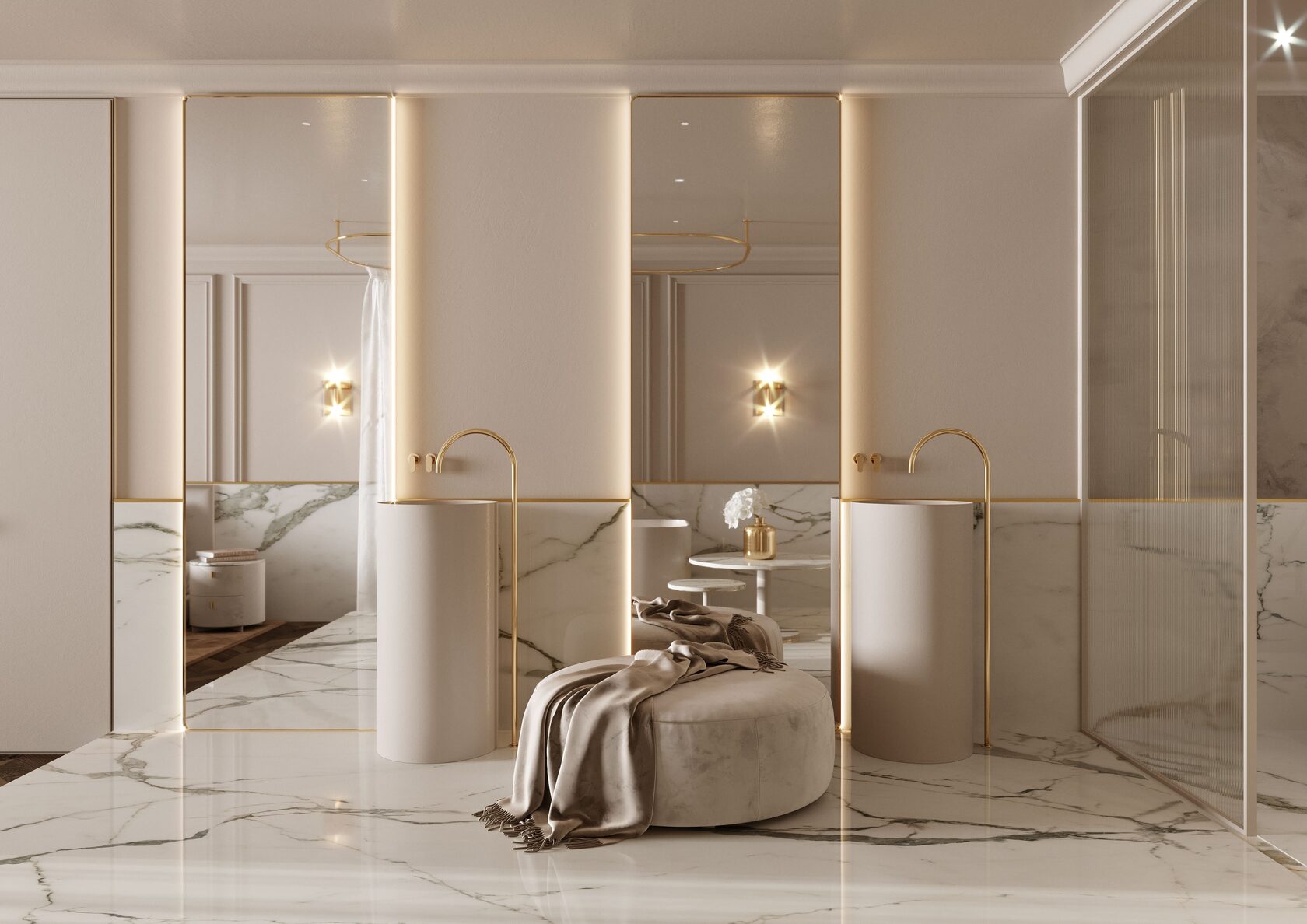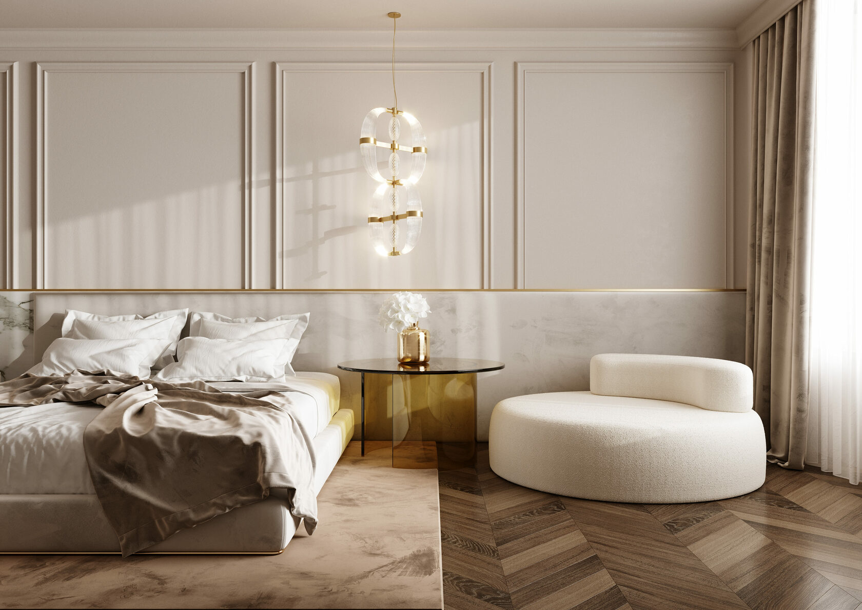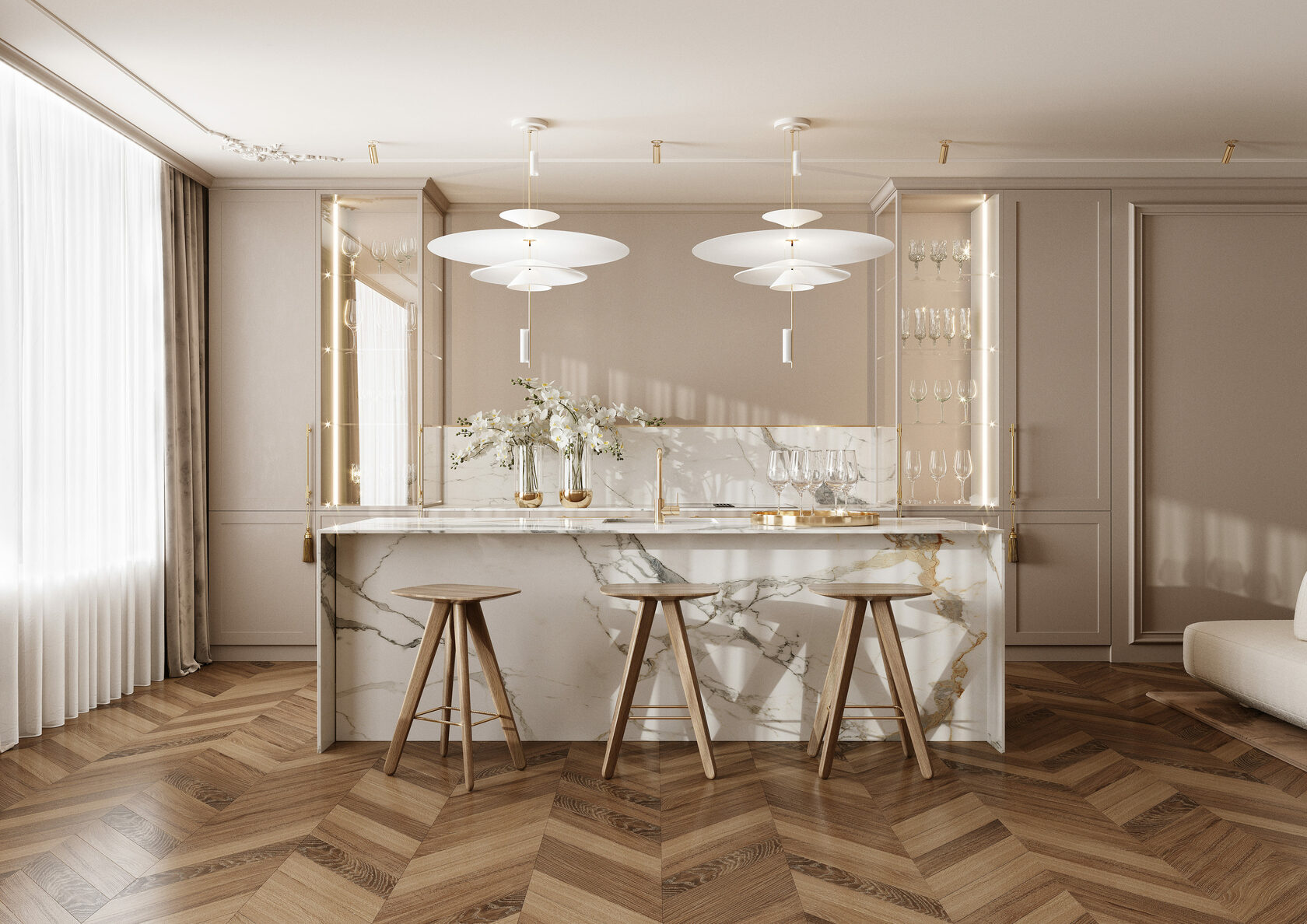 По желанию клиента проект выполнен в светло бежевых тонах и дополнили интерьер отделкой из натурального камня, который подчеркивает лаконичный стиль.